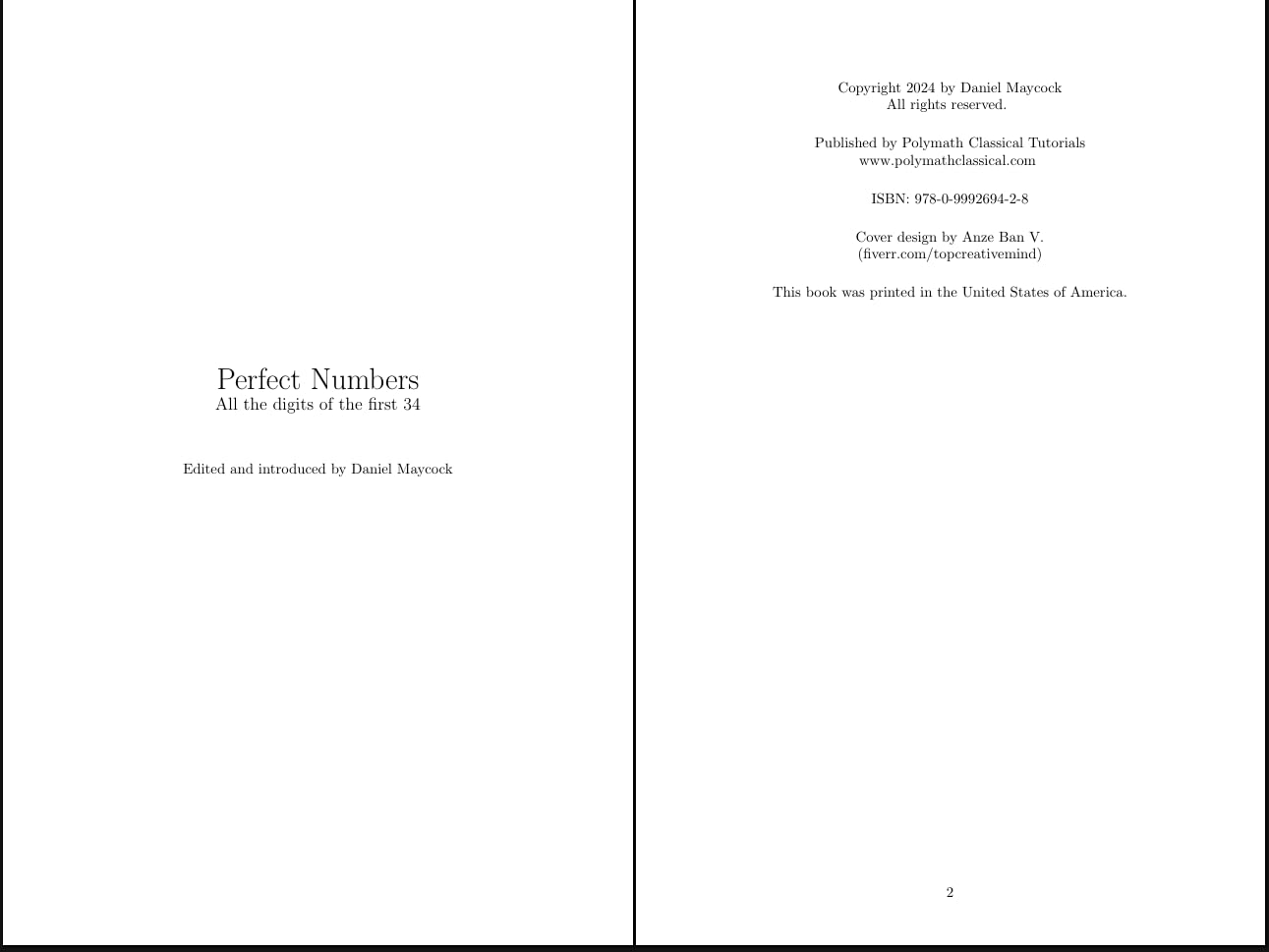 Long numbers have fascinated people for centuries. Memorizing digits of pi has become something of a sport, and hundreds of computers are daily searching for ever larger prime numbers. For the first time ever, this book presents all the digits of the first 34 perfect numbers. This unique book makes a great gift for your favorite mathematician or book nerd.