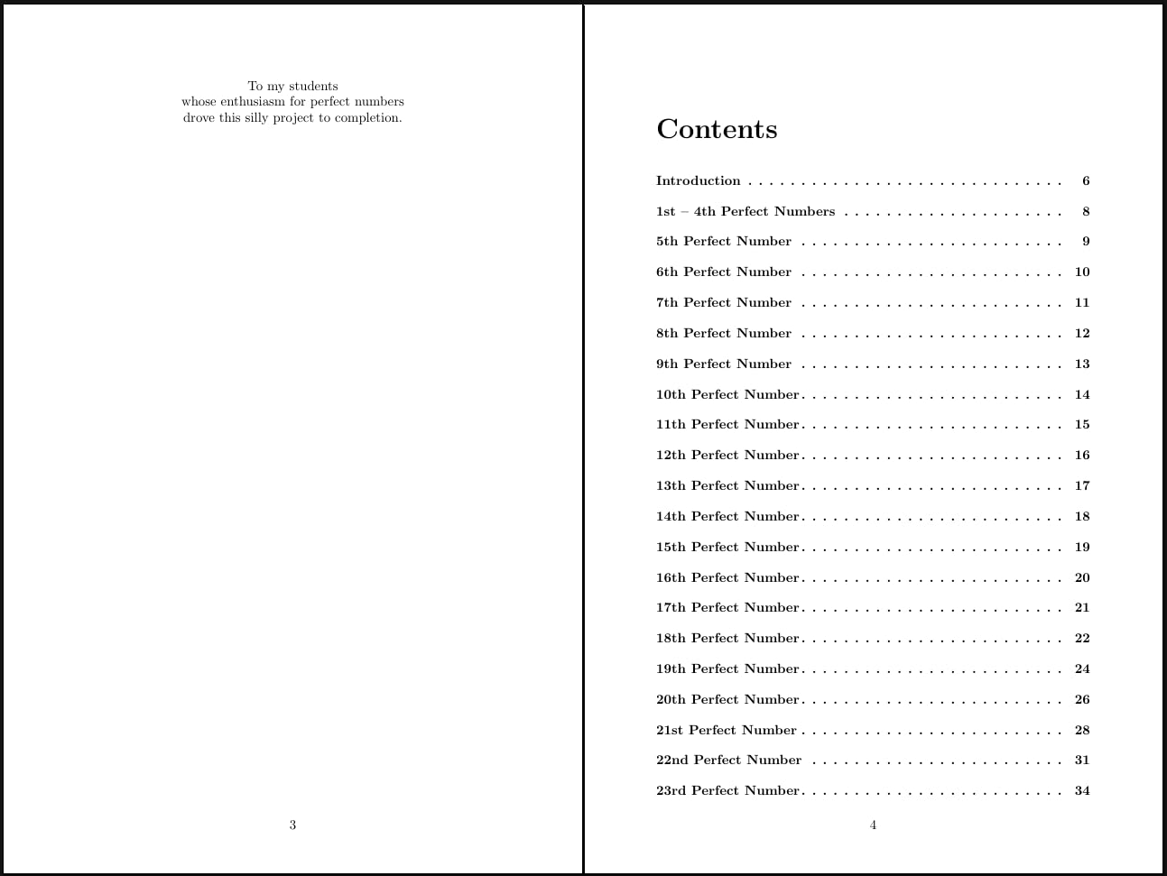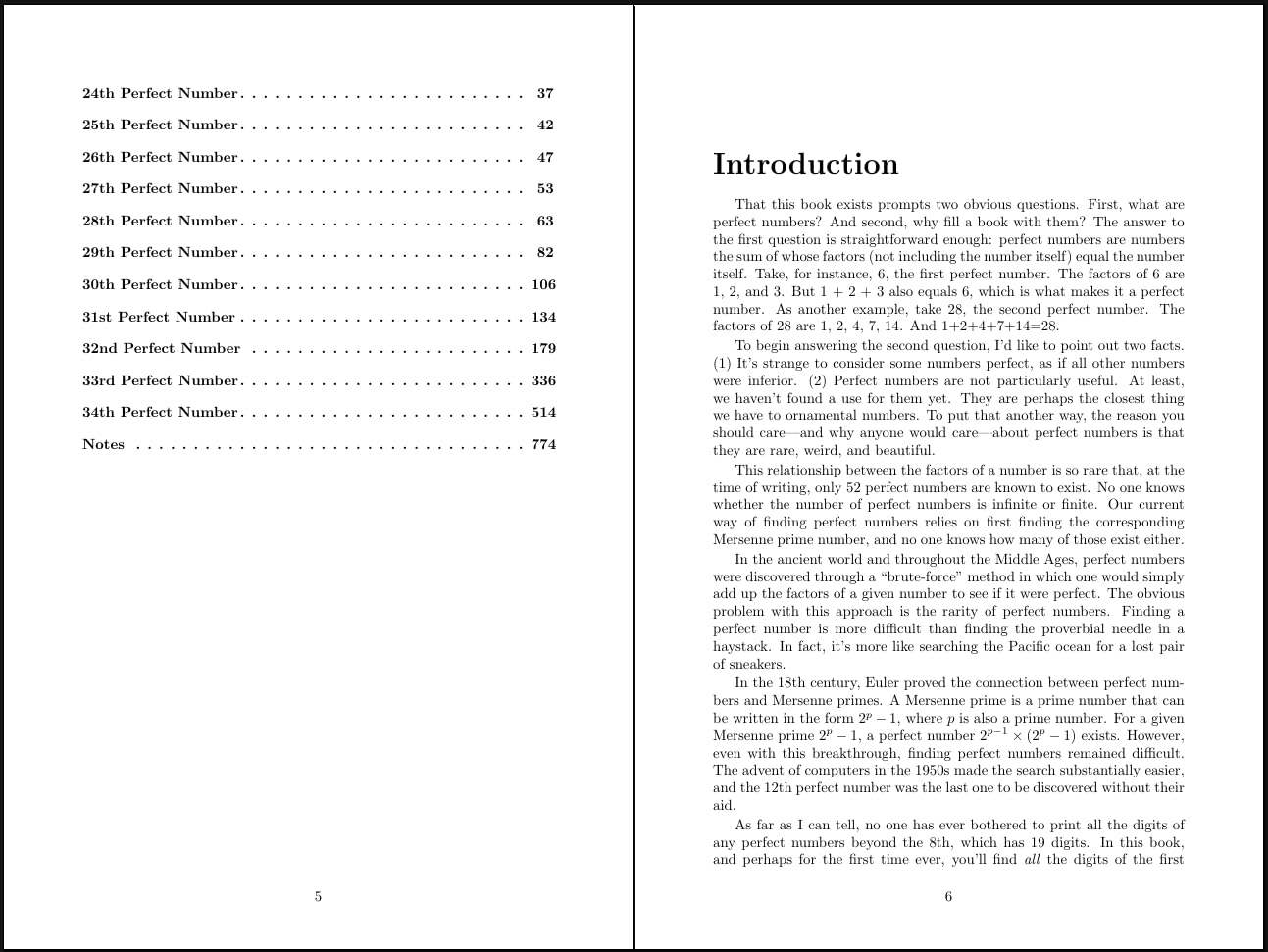 “That this book exists prompts two obvious questions. First, what are perfect numbers? And second, why fill a book with them? You’ll find the answers to both of these questions inside.