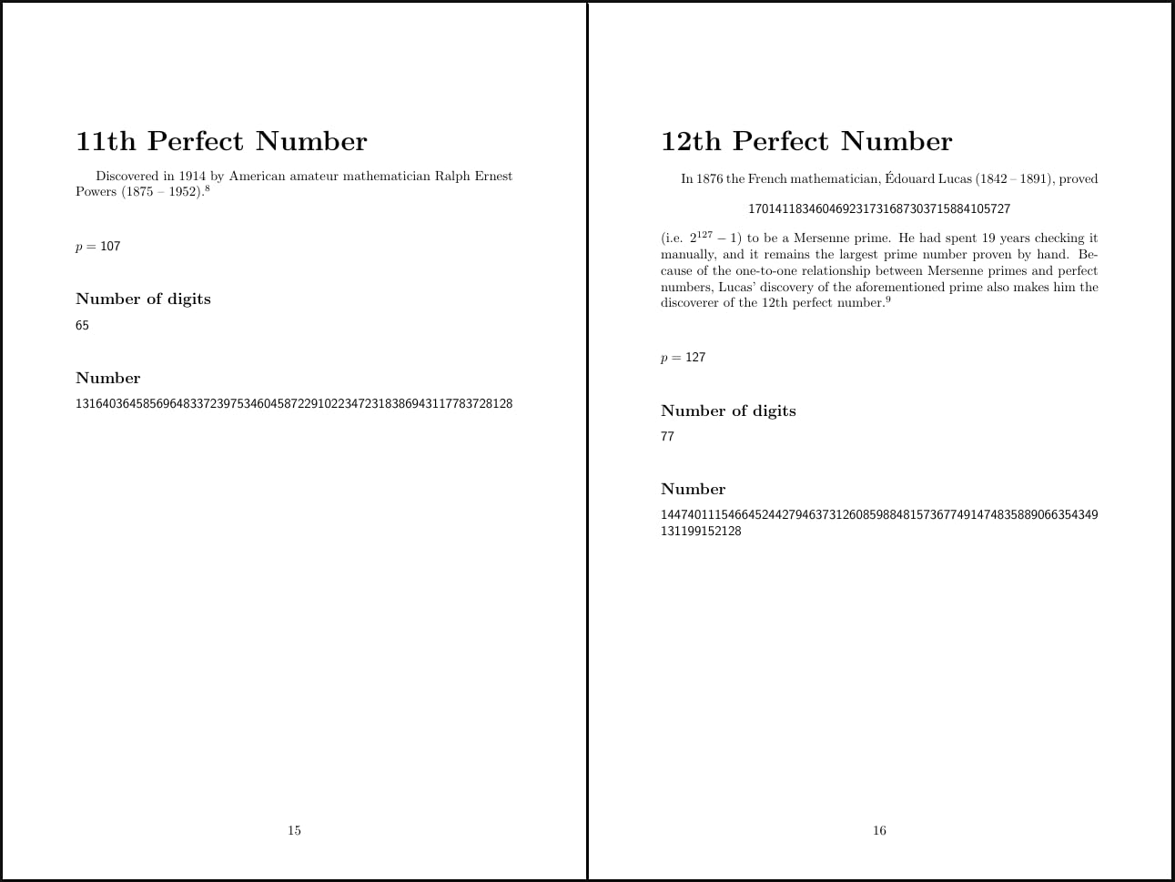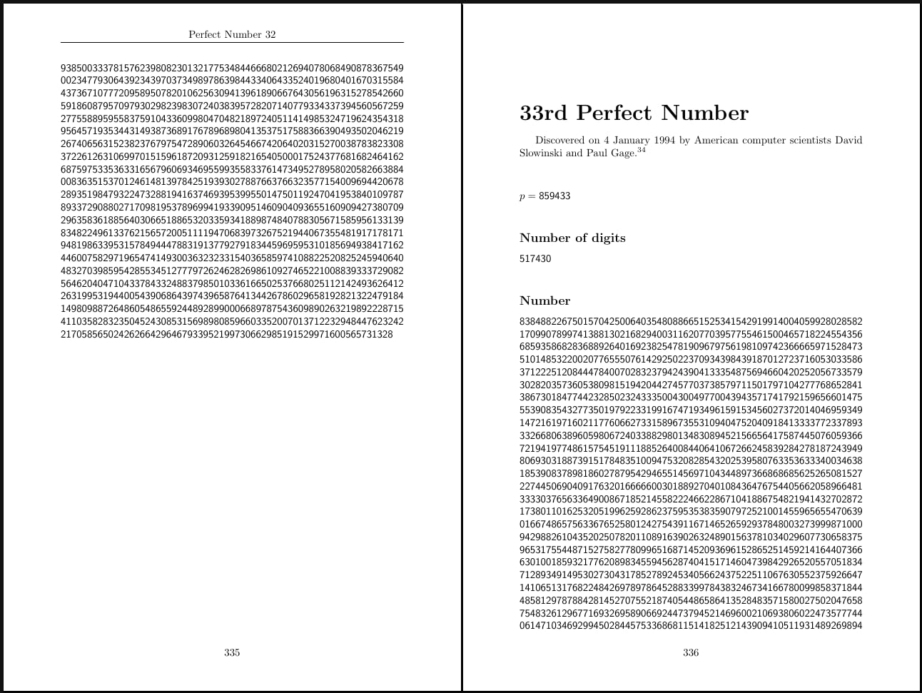Inside, you’ll find a brief explanatory introduction, and each of the first 34 perfect numbers printed in full (yes, every single one of the thousands and thousands of digits). Each number is preceded by a short entry detailing the name of its discoverer, the date of its discovery, and the number’s digit-length.